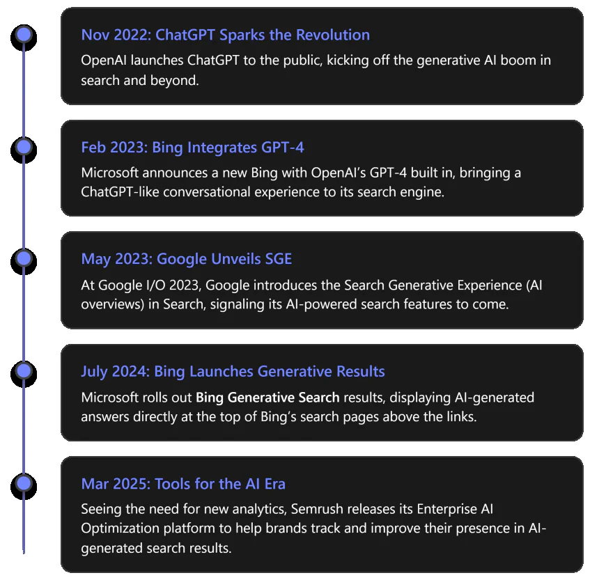 Platform Approach to AI Search Marketing Advantage Perplexity AI Standalone AI search engine with conversational Q&A that cites sources for its answers. Transparency: Sources are shown, so users can click through. If your content is cited, you gain direct visibility and credibility. Microsoft Copilot AI assistant integrated across Bing, Windows, and Office, providing interactive, context-aware search and help. Ubiquity: Brings search into users’ daily workflow (browser, desktop, apps). Optimizing for it ensures your info appears wherever users ask questions. Semrush Enterprise AIO Analytics platform for monitoring & optimizing brand visibility in AI-generated search results. Insight: Helps you understand where and how your brand appears in AI answers, informing your GEO strategy to improve presence and sentiment. DuckDuckGo DuckAssist AI-powered instant answers drawing from Wikipedia, integrated into DuckDuckGo’s private search. Reach: Even niche search engines use AI. Ensuring your content (e.g. Wikipedia presence) is solid can capture these alternative searchers. The table above highlights just a few examples, but the key theme is diversification of search. Users now have many ways to ask questions and discover content via AI. As a marketer, it’s wise to engage with these emerging platforms early. For instance, you might create a presence on platforms that allow contributions – some companies are experimenting with providing official answers on forums that AI often quotes (like StackExchange or Quora), thereby influencing the AI outputs. Or you might use the data from tools like Semrush AIO to find out that, say, YouTube is frequently being pulled into AI answers for “how-to” queries in your niche – that insight could lead you to produce more video content.In terms of strategy: keep your content adaptable and API-friendly. Some of these AI platforms might use feeds or APIs (for example, a future where you can submit data to an AI search index). Structuring your content semantically (using proper HTML, JSON-LD, etc.) ensures it’s easily digestible by any AI. And always, focus on user intent – each platform may have its twist, but they all strive to satisfy the user’s question. If your content does that well, it has a chance to surface, whether it’s via a Google AI overview, a Bing chat, or a new AI search app. -